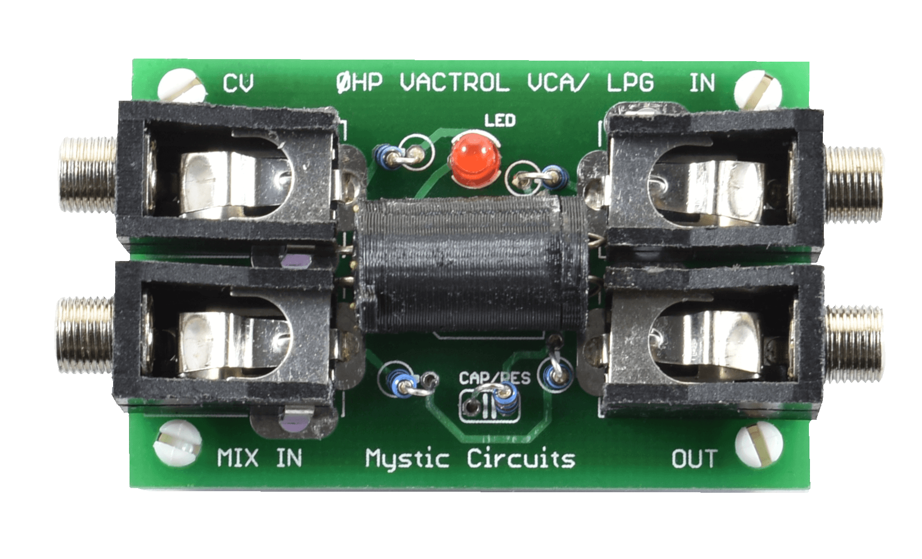 0HP Vactrol based modules take advantage of an outdated part to rough the edges of your sound. What sets Vactrol-based circuits apart is that they will slow down any incoming control voltages, allowing them to convert a gate or trigger CV input into very musical envelopes. Both the Vactrol Low Pass Gate and the Vactrol Voltage Controlled Amplifier modulate the amplitude of a signal under voltage control, but the VCA does so with minimal alteration to the sound whereas the LPG filters the sound to give it some extra weight. Both modules feature a 'mix input' allowing for passive mixing with other sound sources or daisy chaining of multiple Vactrol modules. Please note that all Vactrols are unique snowflakes and as such each module will have a different response curve.